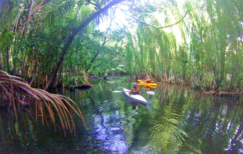 First we took the SUP’s and the kayaks up a small river at the end of the harbour. It’s a beautiful place with lots of palms and overhanging trees into the water. The further up the river we went, the fresher the water became making it great for a refreshing swim.